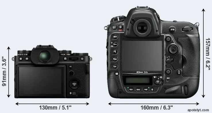 If the front view area (width x height) of the cameras is taken as an aggregate measure of their size, the Nikon D4S is considerably larger (112 percent) than the Fujifilm X-T5. Moreover, the D4S is substantially heavier (142 percent) than the X-T5. In this context, it is worth noting that both cameras are splash and dust-proof and can, hence, be used in inclement weather conditions or harsh environments.
