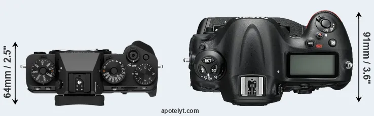 The physical size and weight of the Fujifilm X-T5 and the Nikon D4S are illustrated in the side-by-side display below. The two cameras are presented according to their relative size. Three consecutive views from the front, the top, and the rear side are shown. All width, height and depth measures are rounded to the nearest millimeter.