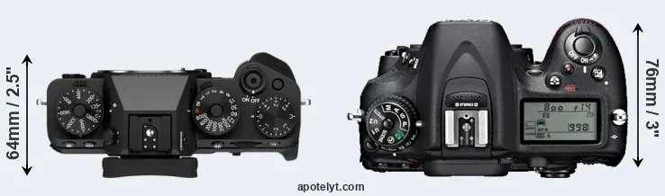 The side-by-side display below illustrates the physical size and weight of the Fujifilm X-T5 and the Nikon D7100. The two cameras are presented according to their relative size. Three consecutive views from the front, the top, and the rear side are shown. All width, height and depth measures are rounded to the nearest millimeter.