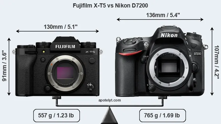 The side-by-side display below illustrates the physical size and weight of the Fujifilm X-T5 and the Nikon D7200. The two cameras are presented according to their relative size. Three consecutive views from the front, the top, and the rear side are shown. All width, height and depth measures are rounded to the nearest millimeter.
