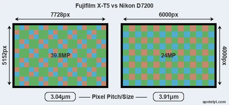 | Sensor Specs | Fujifilm X-T5 | Nikon D7200 |