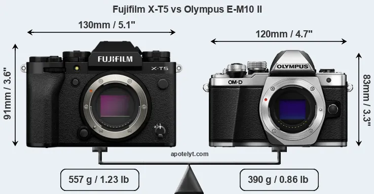 An illustration of the physical size and weight of the Fujifilm X-T5 and the Olympus E-M10 II is provided in the side-by-side display below. The two cameras are presented according to their relative size. Three successive views from the front, the top, and the rear are shown. All width, height and depth dimensions are rounded to the nearest millimeter.