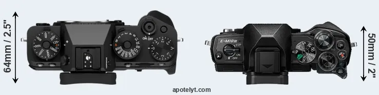 The physical size and weight of the Fujifilm X-T5 and the Olympus E-M10 III are illustrated in the side-by-side display below. The two cameras are presented according to their relative size. Three successive views from the front, the top, and the rear are shown. All width, height and depth dimensions are rounded to the nearest millimeter.