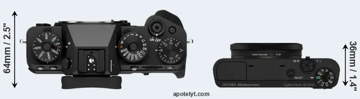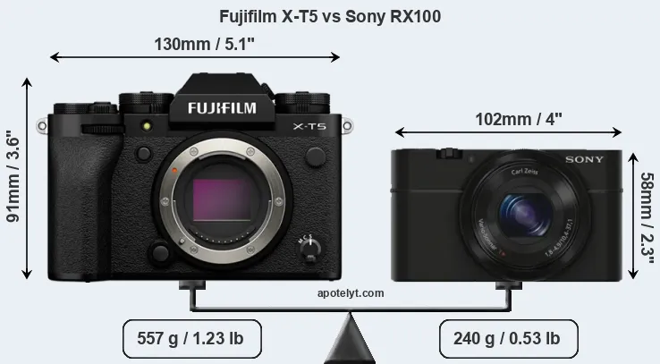 The side-by-side display below illustrates the physical size and weight of the Fujifilm X-T5 and the Sony RX100. The two cameras are presented according to their relative size. Three consecutive perspectives from the front, the top, and the back are available. All width, height and depth dimensions are rounded to the nearest millimeter.