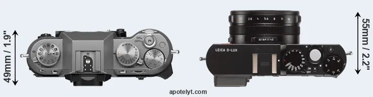 The side-by-side display below illustrates the physical size and weight of the Fujifilm X-T50 and the Leica D-LUX Typ 109. The two cameras are presented according to their relative size. Three consecutive views from the front, the top, and the rear side are shown. All width, height and depth dimensions are rounded to the nearest millimeter.