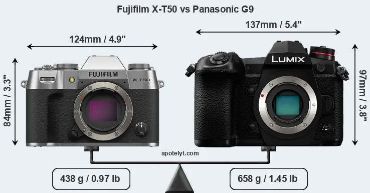 The side-by-side display below illustrates the physical size and weight of the Fujifilm X-T50 and the Panasonic G9. The two cameras are presented according to their relative size. Three consecutive perspectives from the front, the top, and the back are available. All size dimensions are rounded to the nearest millimeter.