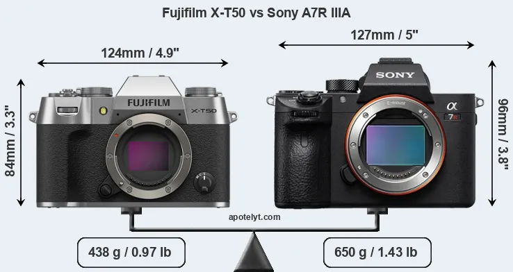 If the front view area (width x height) of the cameras is taken as an aggregate measure of their size, the Sony A7R IIIA is notably larger (17 percent) than the Fujifilm X-T50. Moreover, the A7R IIIA is substantially heavier (48 percent) than the X-T50. It is noteworthy in this context that the A7R IIIA is splash and dust-proof, while the X-T50 does not feature any corresponding weather-sealing.