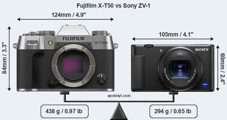 An illustration of the physical size and weight of the Fujifilm X-T50 and the Sony ZV-1 is provided in the side-by-side display below. The two cameras are presented according to their relative size. Three consecutive perspectives from the front, the top, and the back are available. All width, height and depth dimensions are rounded to the nearest millimeter.