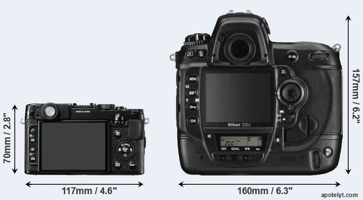 The side-by-side display below illustrates the physical size and weight of the Fujifilm X10 and the Nikon D3X. The two cameras are presented according to their relative size. Three consecutive views from the front, the top, and the rear side are shown. All width, height and depth dimensions are rounded to the nearest millimeter.
