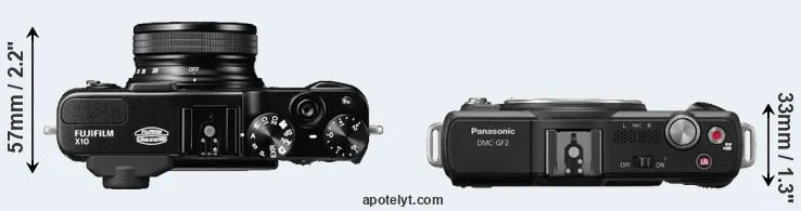The side-by-side display below illustrates the physical size and weight of the Fujifilm X10 and the Panasonic GF2. The two cameras are presented according to their relative size. Three consecutive views from the front, the top, and the rear side are shown. All width, height and depth dimensions are rounded to the nearest millimeter.