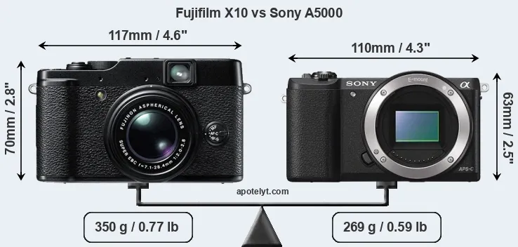 An illustration of the physical size and weight of the Fujifilm X10 and the Sony A5000 is provided in the side-by-side display below. The two cameras are presented according to their relative size. Three successive views from the front, the top, and the rear are shown. All size dimensions are rounded to the nearest millimeter.