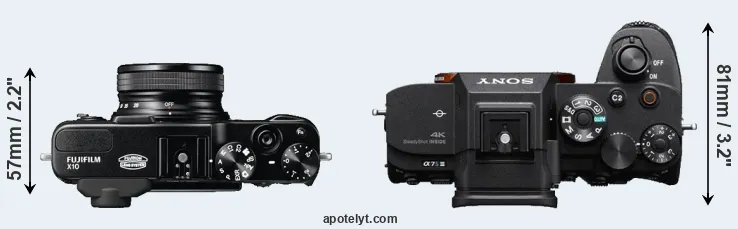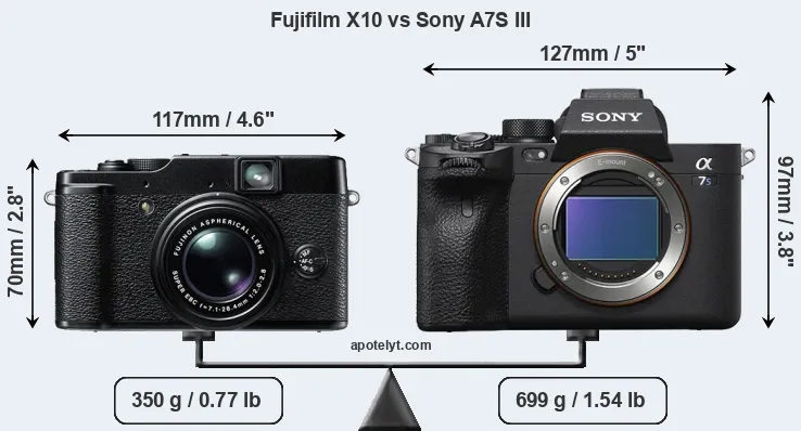 An illustration of the physical size and weight of the Fujifilm X10 and the Sony A7S III is provided in the side-by-side display below. The two cameras are presented according to their relative size. Three consecutive perspectives from the front, the top, and the back are available. All width, height and depth measures are rounded to the nearest millimeter.