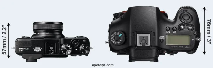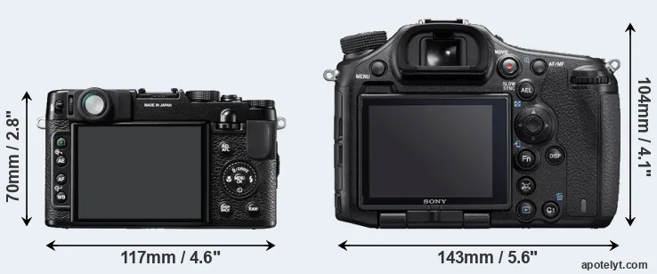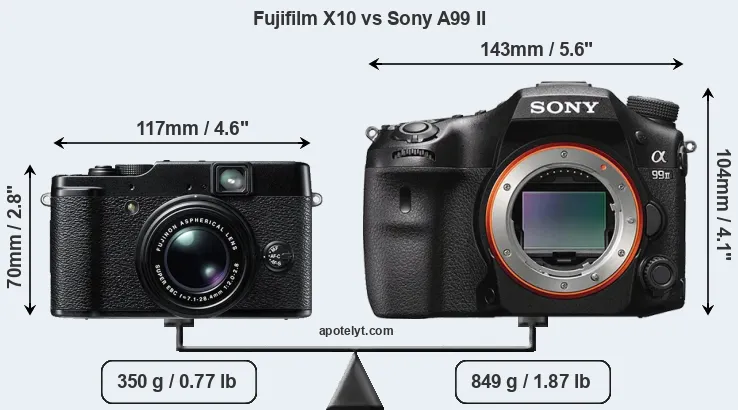 The side-by-side display below illustrates the physical size and weight of the Fujifilm X10 and the Sony A99 II. The two cameras are presented according to their relative size. Three successive views from the front, the top, and the rear are shown. All width, height and depth dimensions are rounded to the nearest millimeter.