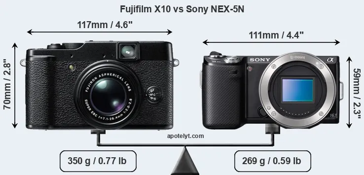 The side-by-side display below illustrates the physical size and weight of the Fujifilm X10 and the Sony NEX-5N. The two cameras are presented according to their relative size. Three successive views from the front, the top, and the rear are shown. All width, height and depth dimensions are rounded to the nearest millimeter.