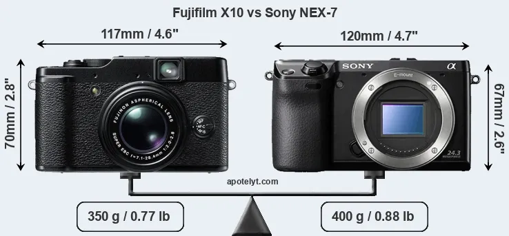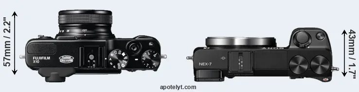 The side-by-side display below illustrates the physical size and weight of the Fujifilm X10 and the Sony NEX-7. The two cameras are presented according to their relative size. Three consecutive perspectives from the front, the top, and the back are available. All width, height and depth measures are rounded to the nearest millimeter.