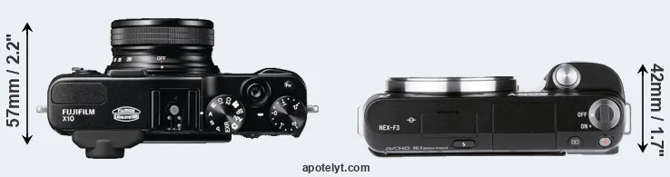 The physical size and weight of the Fujifilm X10 and the Sony NEX-F3 are illustrated in the side-by-side display below. The two cameras are presented according to their relative size. Three successive views from the front, the top, and the rear are shown. All size dimensions are rounded to the nearest millimeter.