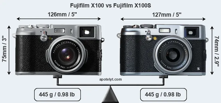 If the front view area (width x height) of the cameras is taken as an aggregate measure of their size, the Fujifilm X100 and the Fujifilm X100S are of equal size. Similarly, the two cameras are very close in terms of weight. In this context, it is worth noting that neither the X100 nor the X100S are weather-sealed.