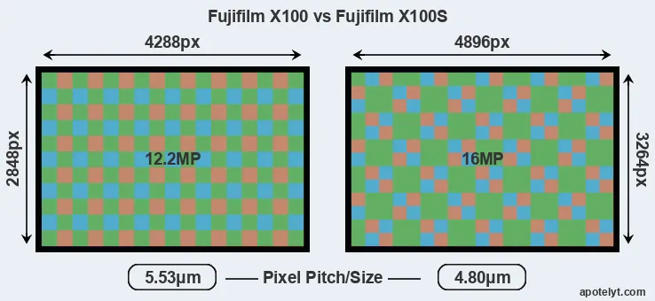 Despite having a slightly smaller sensor, the X100S offers a higher resolution of 16 megapixels, compared with 12.2 MP of the X100. This megapixels advantage comes at the cost of a higher pixel density and a smaller size of the individual pixel (with a pixel pitch of 4.80μm versus 5.53μm for the X100). However, it should be noted that the X100S is much more recent (by 2 years and 3 months) than the X100, and its sensor will have benefitted from technological advances during this time that make it possible to gather light more efficiently. Coming back to sensor resolution, it should be mentioned that the X100S has no anti-alias filter installed, so that it can capture all the detail its sensor resolves.