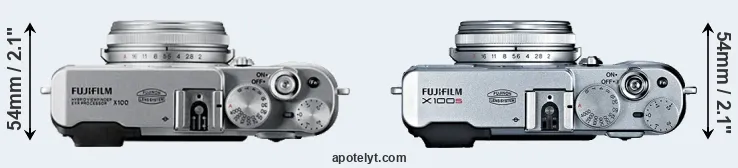 An illustration of the physical size and weight of the Fujifilm X100 and the Fujifilm X100S is provided in the side-by-side display below. The two cameras are presented according to their relative size. Three consecutive views from the front, the top, and the rear side are shown. All width, height and depth measures are rounded to the nearest millimeter.