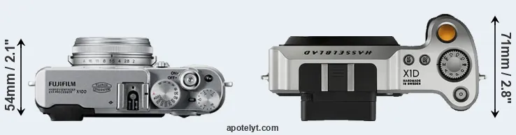 If the front view area (width x height) of the cameras is taken as an aggregate measure of their size, the Hasselblad X1D is considerably larger (56 percent) than the Fujifilm X100. It is noteworthy in this context that the X1D is splash and dust-proof, while the X100 does not feature any corresponding weather-sealing.