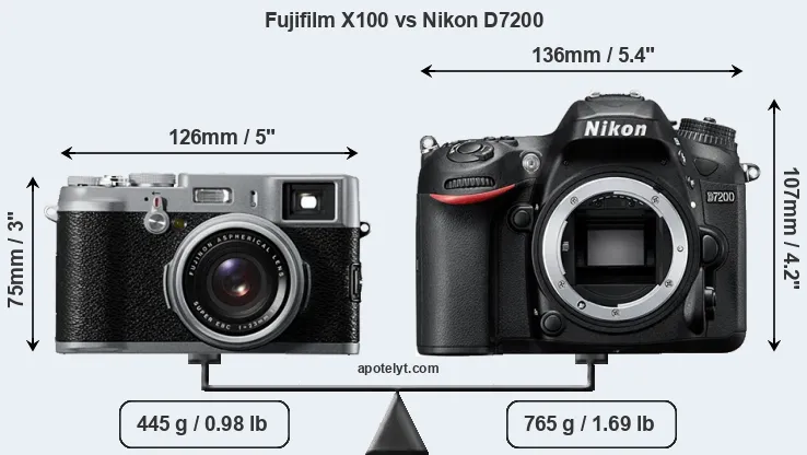 If the front view area (width x height) of the cameras is taken as an aggregate measure of their size, the Nikon D7200 is considerably larger (54 percent) than the Fujifilm X100. It is noteworthy in this context that the D7200 is splash and dust-proof, while the X100 does not feature any corresponding weather-sealing.
