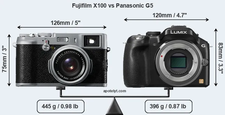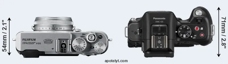 The side-by-side display below illustrates the physical size and weight of the Fujifilm X100 and the Panasonic G5. The two cameras are presented according to their relative size. Three consecutive perspectives from the front, the top, and the back are available. All width, height and depth measures are rounded to the nearest millimeter.