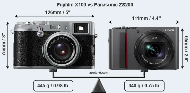 An illustration of the physical size and weight of the Fujifilm X100 and the Panasonic ZS200 is provided in the side-by-side display below. The two cameras are presented according to their relative size. Three consecutive perspectives from the front, the top, and the back are available. All size dimensions are rounded to the nearest millimeter.