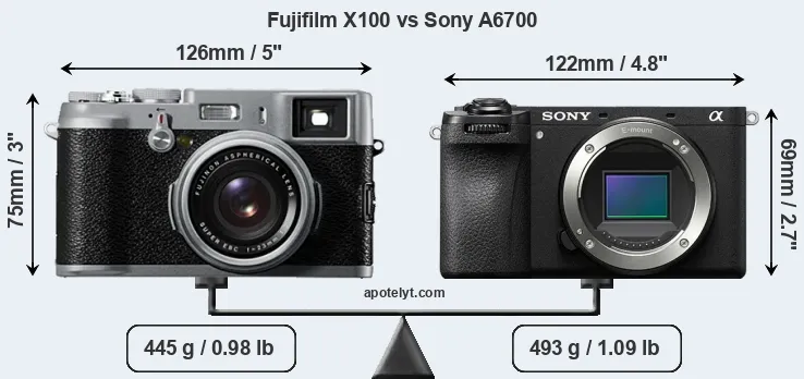 The side-by-side display below illustrates the physical size and weight of the Fujifilm X100 and the Sony A6700. The two cameras are presented according to their relative size. Three consecutive views from the front, the top, and the rear side are shown. All width, height and depth dimensions are rounded to the nearest millimeter.