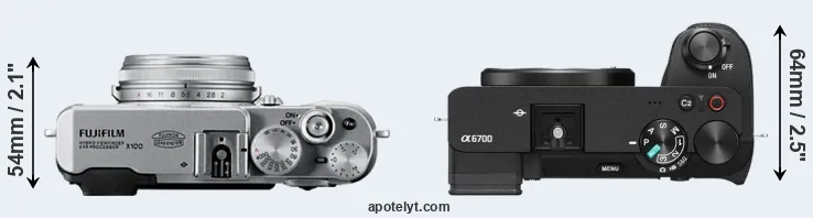 If the front view area (width x height) of the cameras is taken as an aggregate measure of their size, the Sony A6700 is notably smaller (11 percent) than the Fujifilm X100. It is noteworthy in this context that the A6700 is splash and dust-proof, while the X100 does not feature any corresponding weather-sealing.