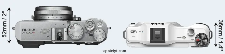 An illustration of the physical size and weight of the Fujifilm X100F and the Kodak S-1 is provided in the side-by-side display below. The two cameras are presented according to their relative size. Three consecutive views from the front, the top, and the rear side are shown. All width, height and depth measures are rounded to the nearest millimeter.