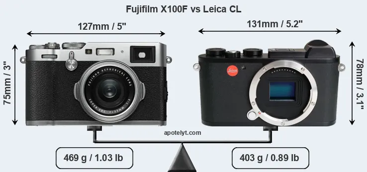 An illustration of the physical size and weight of the Fujifilm X100F and the Leica CL is provided in the side-by-side display below. The two cameras are presented according to their relative size. Three consecutive perspectives from the front, the top, and the back are available. All size dimensions are rounded to the nearest millimeter.