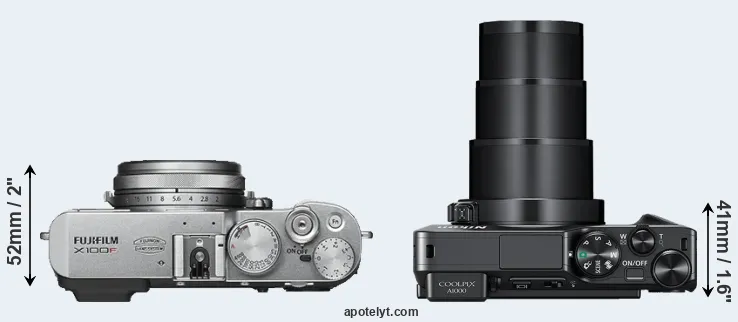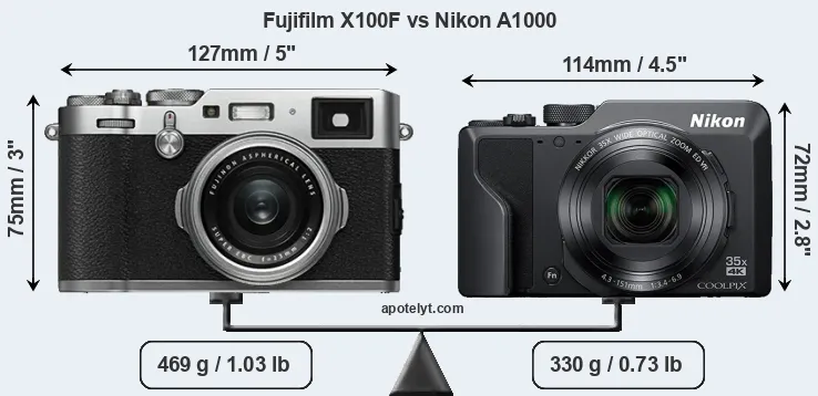 The physical size and weight of the Fujifilm X100F and the Nikon A1000 are illustrated in the side-by-side display below. The two cameras are presented according to their relative size. Three successive views from the front, the top, and the rear are shown. All width, height and depth measures are rounded to the nearest millimeter.