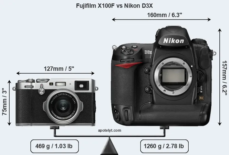If the front view area (width x height) of the cameras is taken as an aggregate measure of their size, the Nikon D3X is considerably larger (164 percent) than the Fujifilm X100F. It is noteworthy in this context that the D3X is splash and dust-proof, while the X100F does not feature any corresponding weather-sealing.