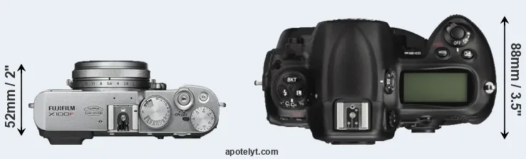 An illustration of the physical size and weight of the Fujifilm X100F and the Nikon D3X is provided in the side-by-side display below. The two cameras are presented according to their relative size. Three consecutive perspectives from the front, the top, and the back are available. All size dimensions are rounded to the nearest millimeter.