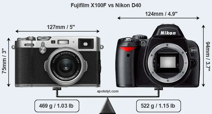 The above size and weight comparisons are to some extent incomplete and possibly misleading, as the X100F has a lens built in, whereas the D40 is an interchangeable lens camera that requires a separate lens. Attaching the latter will add extra weight and bulk to the setup. You can compare the optics available for the D40 and their specifications in the Nikon Lens Catalog.