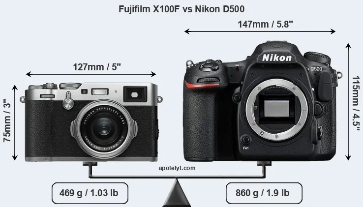 An illustration of the physical size and weight of the Fujifilm X100F and the Nikon D500 is provided in the side-by-side display below. The two cameras are presented according to their relative size. Three consecutive perspectives from the front, the top, and the back are available. All size dimensions are rounded to the nearest millimeter.