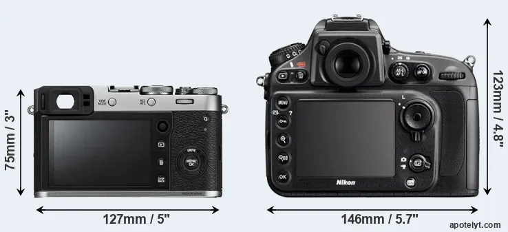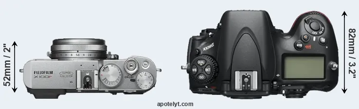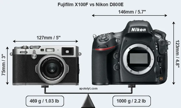 The physical size and weight of the Fujifilm X100F and the Nikon D800E are illustrated in the side-by-side display below. The two cameras are presented according to their relative size. Three consecutive perspectives from the front, the top, and the back are available. All width, height and depth dimensions are rounded to the nearest millimeter.