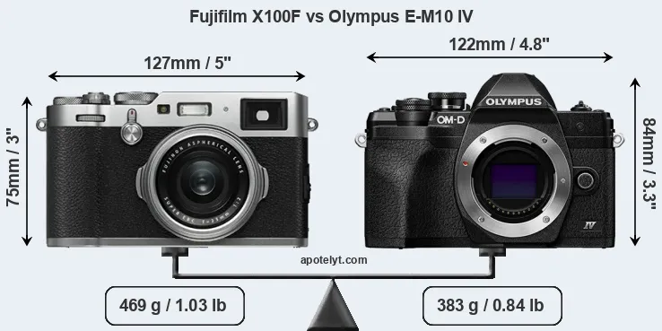 The above size and weight comparisons are to some extent incomplete and possibly misleading, as the X100F has a lens built in, whereas the E-M10 IV is an interchangeable lens camera that requires a separate lens. Attaching the latter will add extra weight and bulk to the setup. You can compare the optics available for the E-M10 IV and their specifications in the Micro Four Thirds Lens Catalog.
