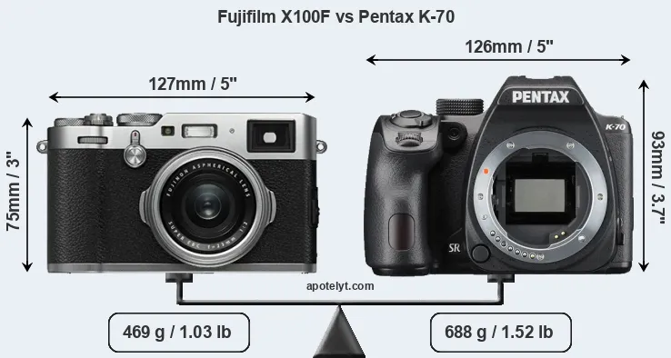 The side-by-side display below illustrates the physical size and weight of the Fujifilm X100F and the Pentax K-70. The two cameras are presented according to their relative size. Three successive views from the front, the top, and the rear are shown. All width, height and depth dimensions are rounded to the nearest millimeter.