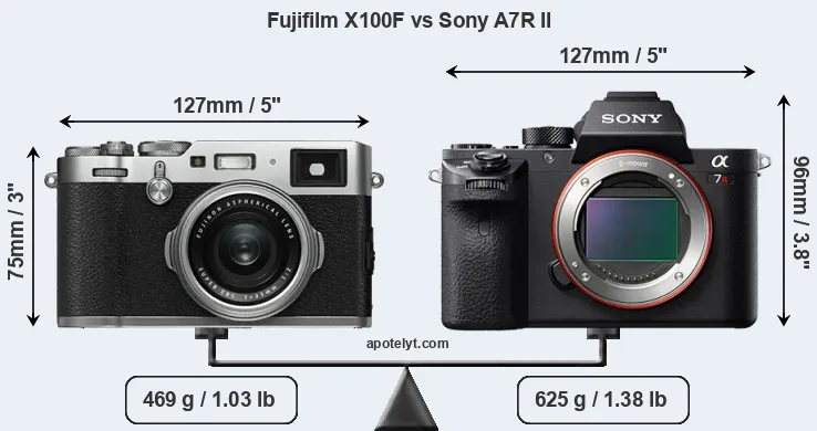 If the front view area (width x height) of the cameras is taken as an aggregate measure of their size, the Sony A7R II is notably larger (28 percent) than the Fujifilm X100F. It is noteworthy in this context that the A7R II is splash and dust-proof, while the X100F does not feature any corresponding weather-sealing.