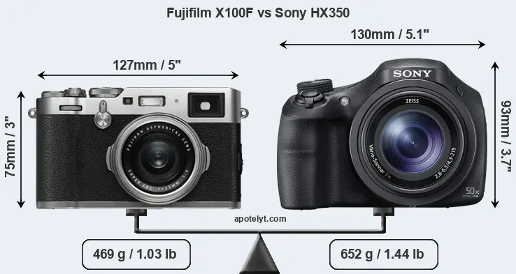 The side-by-side display below illustrates the physical size and weight of the Fujifilm X100F and the Sony HX350. The two cameras are presented according to their relative size. Three consecutive views from the front, the top, and the rear side are shown. All width, height and depth dimensions are rounded to the nearest millimeter.