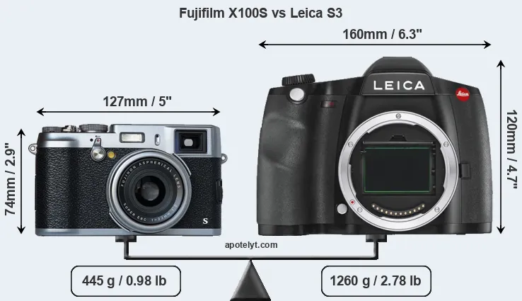If the front view area (width x height) of the cameras is taken as an aggregate measure of their size, the Leica S3 is considerably larger (104 percent) than the Fujifilm X100S. It is noteworthy in this context that the S3 is splash and dust-proof, while the X100S does not feature any corresponding weather-sealing.