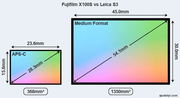 Of the two cameras under consideration, the Fujifilm X100S features an APS-C sensor and the Leica S3 a medium format sensor. The sensor area in the S3 is 267 percent bigger. As a result of these sensor size differences, the cameras have a format factor of, respectively, 1.5 and 0.8. Both cameras have a native aspect ratio (sensor width to sensor height) of 3:2.