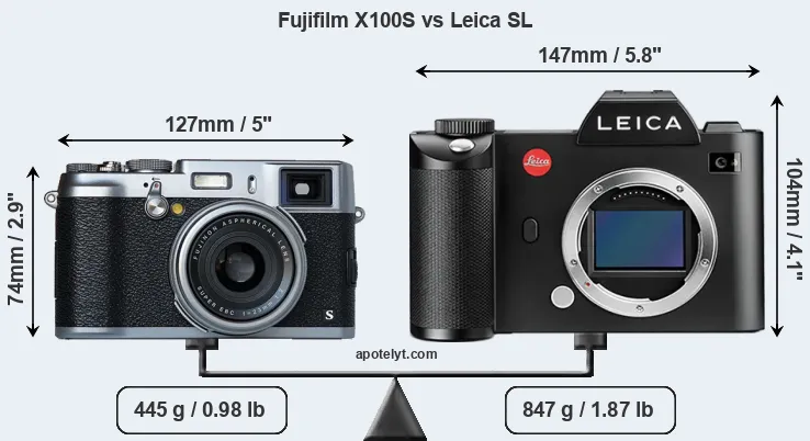 The physical size and weight of the Fujifilm X100S and the Leica SL are illustrated in the side-by-side display below. The two cameras are presented according to their relative size. Three consecutive perspectives from the front, the top, and the back are available. All width, height and depth dimensions are rounded to the nearest millimeter.