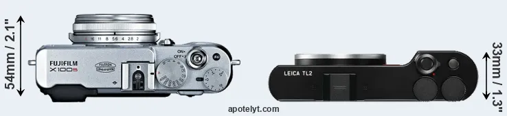 If the front view area (width x height) of the cameras is taken as an aggregate measure of their size, the Leica TL2 is somewhat smaller (2 percent) than the Fujifilm X100S. In this context, it is worth noting that neither the X100S nor the TL2 are weather-sealed.