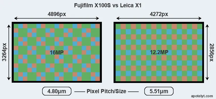 Despite having a slightly smaller sensor, the Fujifilm X100S offers a higher resolution of 16 megapixels, compared with 12.2 MP of the Leica X1. This megapixels advantage comes at the cost of a higher pixel density and a smaller size of the individual pixel (with a pixel pitch of 4.80μm versus 5.51μm for the X1). However, it should be noted that the X100S is much more recent (by 3 years and 3 months) than the X1, and its sensor will have benefitted from technological advances during this time that make it possible to gather light more efficiently. Coming back to sensor resolution, it should be mentioned that the X100S has no anti-alias filter installed, so that it can capture all the detail its sensor resolves.