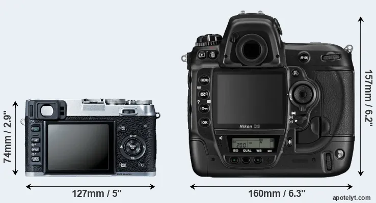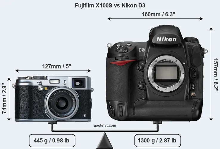 If the front view area (width x height) of the cameras is taken as an aggregate measure of their size, the Nikon D3 is considerably larger (167 percent) than the Fujifilm X100S. It is noteworthy in this context that the D3 is splash and dust-proof, while the X100S does not feature any corresponding weather-sealing.