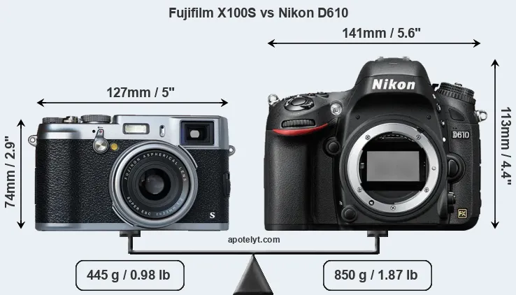 The above size and weight comparisons are to some extent incomplete and possibly misleading, as the X100S has a lens built in, whereas the D610 is an interchangeable lens camera that requires a separate lens. Attaching the latter will add extra weight and bulk to the setup. You can compare the optics available for the D610 and their specifications in the Nikon Lens Catalog.