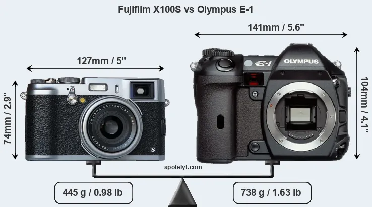 If the front view area (width x height) of the cameras is taken as an aggregate measure of their size, the Olympus E-1 is considerably larger (56 percent) than the Fujifilm X100S. It is noteworthy in this context that the E-1 is splash and dust-proof, while the X100S does not feature any corresponding weather-sealing.