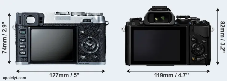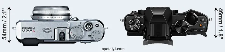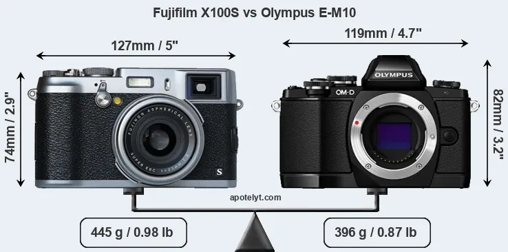 The side-by-side display below illustrates the physical size and weight of the Fujifilm X100S and the Olympus E-M10. The two cameras are presented according to their relative size. Three consecutive perspectives from the front, the top, and the back are available. All width, height and depth dimensions are rounded to the nearest millimeter.